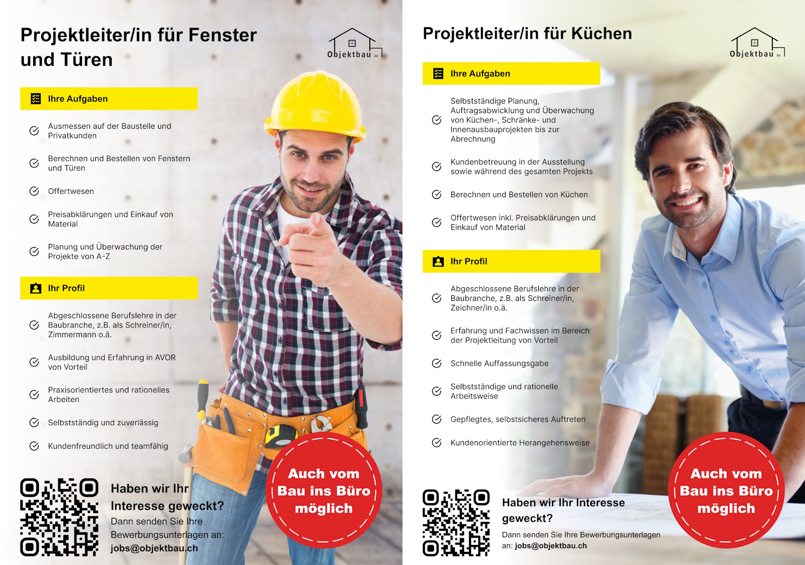 Dann senden Sie Ihre Bewerbungsunterlagen an: jobs@objektbau.ch